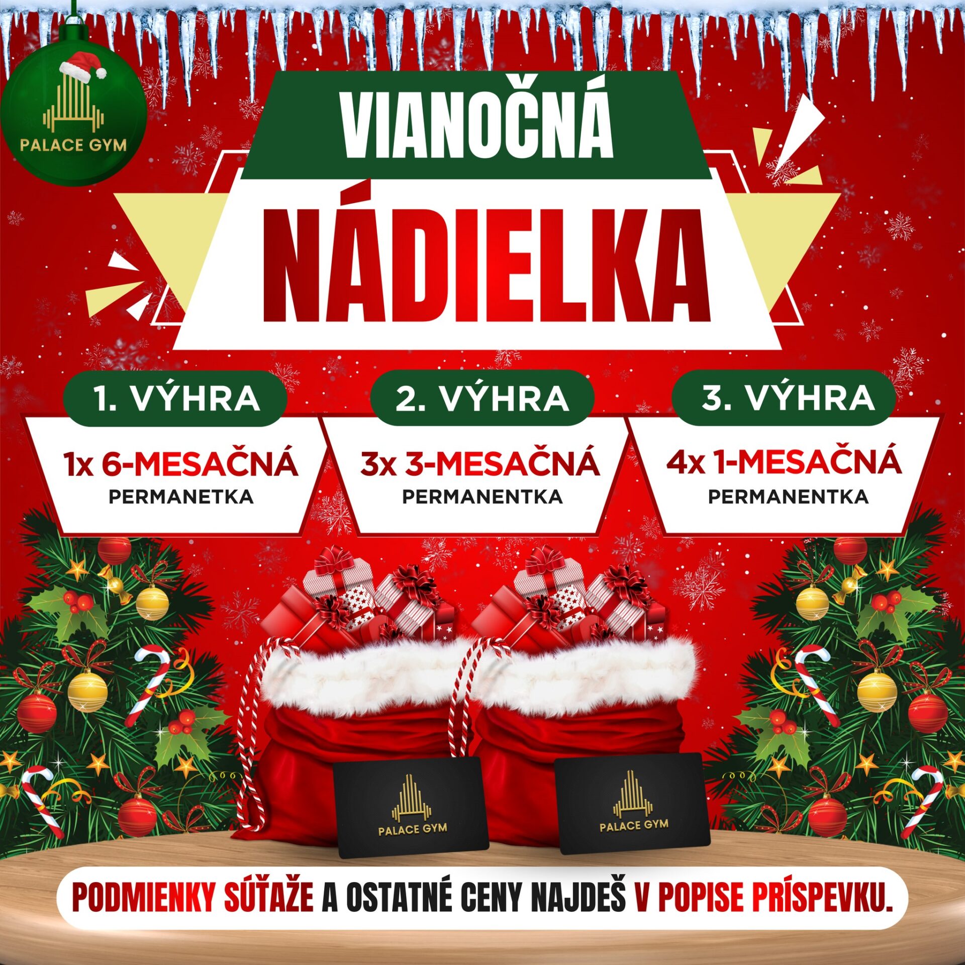 Vianočná nádielka v Palace Gym je vaša šanca vyhrať skvelé ceny v celkovej hodnote viac ako 700€. Zapojiť sa do tejto online súťaže je jednoduché a zábavné. Nezmeškajte príležitosť súťažiť o fantastické darčeky a užite si vianočnú atmosféru. Sledujte stránku na Facebooku a buďte súčasťou najlepších súťaží na internete. Prežite vianočné obdobie inak – s nami súťažíte, vyhrávate a oslavujete!